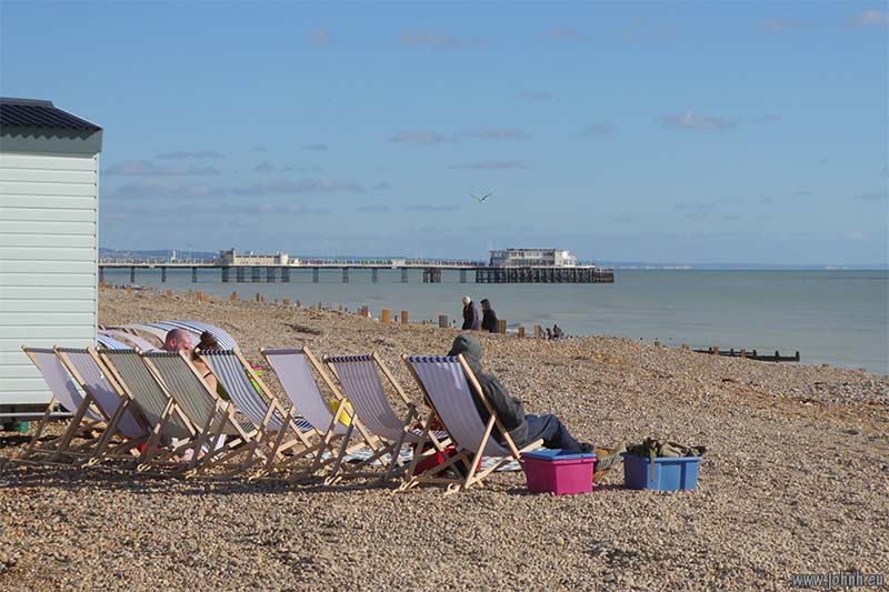 Enjoying a bit of seaside sun and air on the pier at Worthing-on-Sea, Sussex. A notably clear day with both the Isle of Wight and Beachy Head visible.